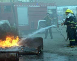 演練現(xiàn)場:消防隊員對火災(zāi)現(xiàn)場進(jìn)行撲救