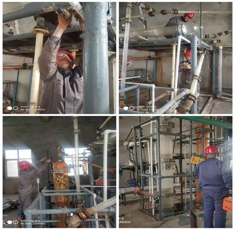 溴素二廠提取冷凝器設(shè)備因使用年限長,冷凝器內(nèi)管有斷裂且沉積物過多堵塞,冷凝效果降低,給溴的蒸餾冷凝及質(zhì)量、產(chǎn)量帶來影響。針對這種狀況,廠班子研究決定對冷凝器進(jìn)行集中更換。由于疫情影響,物流停運,春節(jié)前在石家莊預(yù)定的設(shè)備無法正常發(fā)貨。為了能夠完成生產(chǎn)任務(wù),溴素二廠職工多次對冷凝器漏水部位采取封堵措施,堅持生產(chǎn)運行。