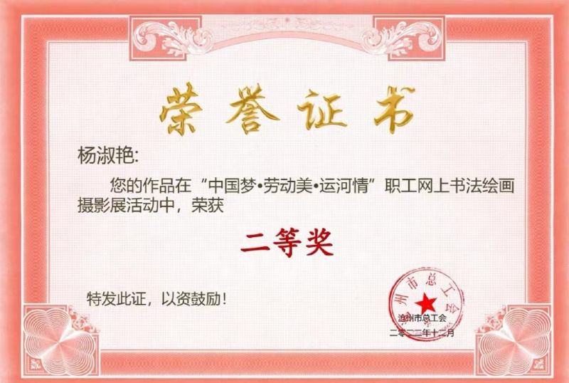 為了進一步營造喜迎二十大、建功新時代的濃厚氛圍,展現(xiàn)全市經(jīng)濟社會發(fā)展的新面貌、新成就,展示工會工作的新亮點、新成效,展現(xiàn)職工群眾的新風采、新貢獻,進一步弘揚勞模精神、勞動精神、工匠精神,滄州市總工會開展了 “中國夢·勞動美·運河情”職工網(wǎng)上書法繪畫攝影展活動。