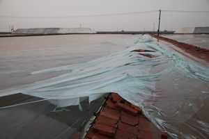 此次災(zāi)害性天氣,造成公司生產(chǎn)場區(qū)大面積結(jié)晶塑膜被毀,部分苫封鹽膜被掀。盡管各生產(chǎn)單元組織人員頂風(fēng)冒雨對刮開撕裂的結(jié)晶池塑膜進行了緊急搶修,但由于塑膜受損面積大,仍造成部分結(jié)晶池鹵水嚴重稀釋,池存鹽受到一定程度的損失,給即將到來的汛前制鹵工作帶來困難,對塑苫池雨季曬鹽造成嚴重威脅。據(jù)統(tǒng)計,因颶風(fēng)撕裂損壞塑膜5763公畝,徹底報廢塑膜1140公畝,損壞滑道10160米,浮板1901米,宿舍、機房頂瓦被掀5500塊,長度約1200米的鹽碼苫封塑膜被徹底損毀。