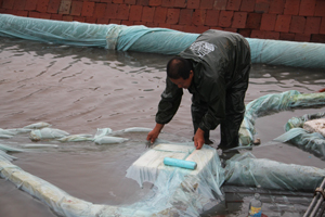災(zāi)情發(fā)生后,公司領(lǐng)導(dǎo)第一時間趕赴受災(zāi)現(xiàn)場,組織全體干部職工進行抗災(zāi)自救。各制鹽場不等不靠,斗志不減,搶排淡水,搶修塑苫。在不到一天的時間里,可修復(fù)的塑苫就初步搶修完畢,為6月8日和9日的雷雨天氣做好了充分準備。雖然8日強對流天氣沒有降雨,但短時大風(fēng)又使6日已受災(zāi)損傷的鹽碼苫封材料再次受創(chuàng),一線干部職工又加緊搶修,保證了苫膜的度雨能力。