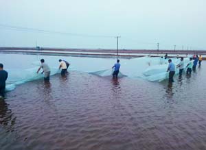 面對(duì)形勢(shì)異常嚴(yán)峻的雨情,公司保原鹽、保塑苫、保灘田的搶險(xiǎn)戰(zhàn)役打響了,從7月17日的141.2毫米暴雨開始,防汛副總指揮李蜻海就防汛工作進(jìn)行了安排:生產(chǎn)部負(fù)責(zé)好全公司防汛工作的統(tǒng)一調(diào)度工作,制鹵場(chǎng)要想盡一切辦法確保主排淡系統(tǒng)的疏通,并要求各制鹽場(chǎng)的防汛指揮機(jī)構(gòu)組織全部啟動(dòng),全體一線干部職工都要隨時(shí)待命,嚴(yán)陣以待,嚴(yán)防死守,做好搶險(xiǎn)自救工作。與此同時(shí),防汛副總指揮李蜻海帶領(lǐng)生產(chǎn)部、制鹵場(chǎng)有關(guān)人員對(duì)主排淡系統(tǒng)進(jìn)行了詳細(xì)巡查,并積極協(xié)調(diào)相關(guān)部門對(duì)影響排淡的17處堵卡地段進(jìn)行了徹底的加寬疏通清理。隨著7月21日60.2毫米降水的到來, 29日、30日,8月2日、3日連續(xù)四場(chǎng)計(jì)270毫米的強(qiáng)降水席卷了整個(gè)生產(chǎn)場(chǎng)區(qū),生產(chǎn)基礎(chǔ)遭受到空前的劫難,隨著化工企業(yè)、海通物流、周邊村莊荒水以及縣辦及周邊鹽場(chǎng)排淡水的大量涌入公司主排淡溝道,使排淡溝道水位迅猛上漲,外圍水位已經(jīng)高于灘內(nèi)水位,灘內(nèi)淡水無法外排,情況萬分緊急,公司防汛形勢(shì)處于一級(jí)警戒狀態(tài)。
