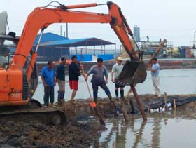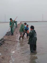 災(zāi)情發(fā)生后,公司干部職工沖上前線,自29日開始,制鹽一、二場(chǎng)地勢(shì)低洼灘副的駁鹽溝、導(dǎo)水路水位相續(xù)開始漫堤,各場(chǎng)班子親自帶隊(duì),組織場(chǎng)突擊隊(duì)立即進(jìn)行長埝擋水,在風(fēng)雨中砸樁、護(hù)埝,多日奮戰(zhàn)在抗災(zāi)一線。在整個(gè)強(qiáng)降雨過程中,灘內(nèi)溝埝局勢(shì)多次告急,排淡溝道水位持續(xù)上漲,鹽碼安全岌岌可危,公司防汛辦晝夜巡查汛情,多次下令各制鹽場(chǎng)要統(tǒng)一行動(dòng),令行禁止,在供電處的大力配合下有序排水,各制鹽隊(duì)都從大局出發(fā),自覺定時(shí)關(guān)閉一切強(qiáng)排水泵。汛情關(guān)鍵時(shí)刻,公司防汛辦結(jié)合鹽業(yè)裝備制造廠緊急調(diào)用兩臺(tái)挖掘機(jī)坐陣一場(chǎng)、二場(chǎng)、制鹵場(chǎng),做好危埝的加固長高和疏通排淡工作,并及時(shí)貫通一、二場(chǎng)排淡系統(tǒng),對(duì)二場(chǎng)過高的警戒水位進(jìn)行有效的疏導(dǎo)。制鹽三場(chǎng)、制鹵場(chǎng)也及時(shí)組織人員,對(duì)儲(chǔ)鹵汪子土埝出現(xiàn)潰溢的地段進(jìn)行了排險(xiǎn)加固。災(zāi)情牽動(dòng)著各級(jí)領(lǐng)導(dǎo)的心,在險(xiǎn)情最危急時(shí)刻,董事長劉建軍夜間來到現(xiàn)場(chǎng)巡視災(zāi)情,慰問職工,指導(dǎo)救災(zāi)工作;公司防汛指揮部成員也來到汛情嚴(yán)重的制鹽一、二場(chǎng)參與搶險(xiǎn)工作;鹽業(yè)裝備制造廠、供電處、供應(yīng)處、筑裝處按照公司防汛指揮部統(tǒng)一安排,出動(dòng)70余人組成的搶險(xiǎn)突擊隊(duì)冒雨和二場(chǎng)全體干部職工一起搶險(xiǎn)救災(zāi)。在整個(gè)抗災(zāi)搶險(xiǎn)過程中,全公司先后投入編織袋32500條,木樁3186根,人工護(hù)埝20190米,動(dòng)用機(jī)械設(shè)備護(hù)埝10220米,清淤場(chǎng)區(qū)周邊堵卡地段17處。
