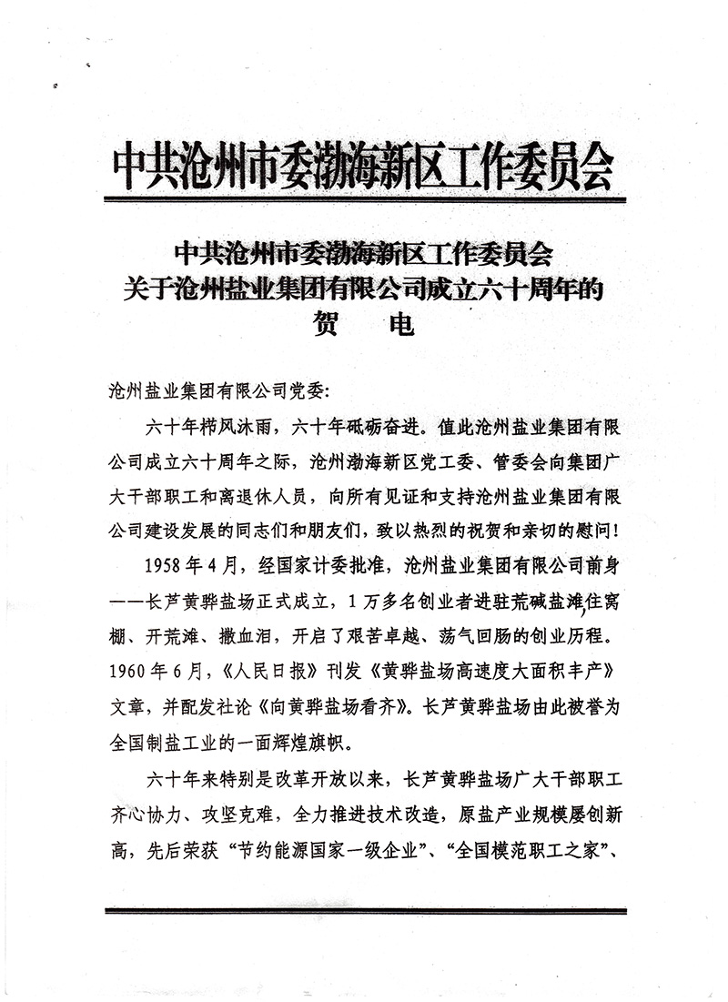 滄州渤海新區(qū)黨工委、管委會(huì)發(fā)來賀電,對公司成立六十周年表示祝賀,對公司過往取得的輝煌成就予以充分肯定,并寄望滄鹽集團(tuán)繼續(xù)發(fā)揚(yáng)滄鹽精神,深化改革,加快推進(jìn)轉(zhuǎn)型升級,助力滄州渤海新區(qū)高質(zhì)量發(fā)展。